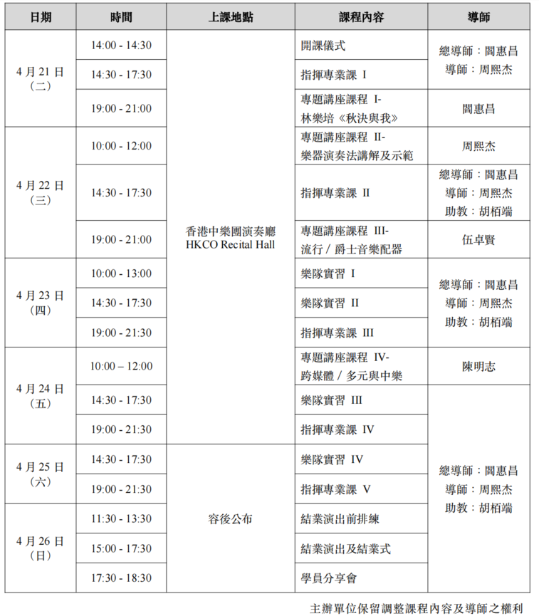 四、 結業演出:參加者選定四首作品之其中一首(或其中一個樂章)指揮樂團,並獲頒發結業證書。