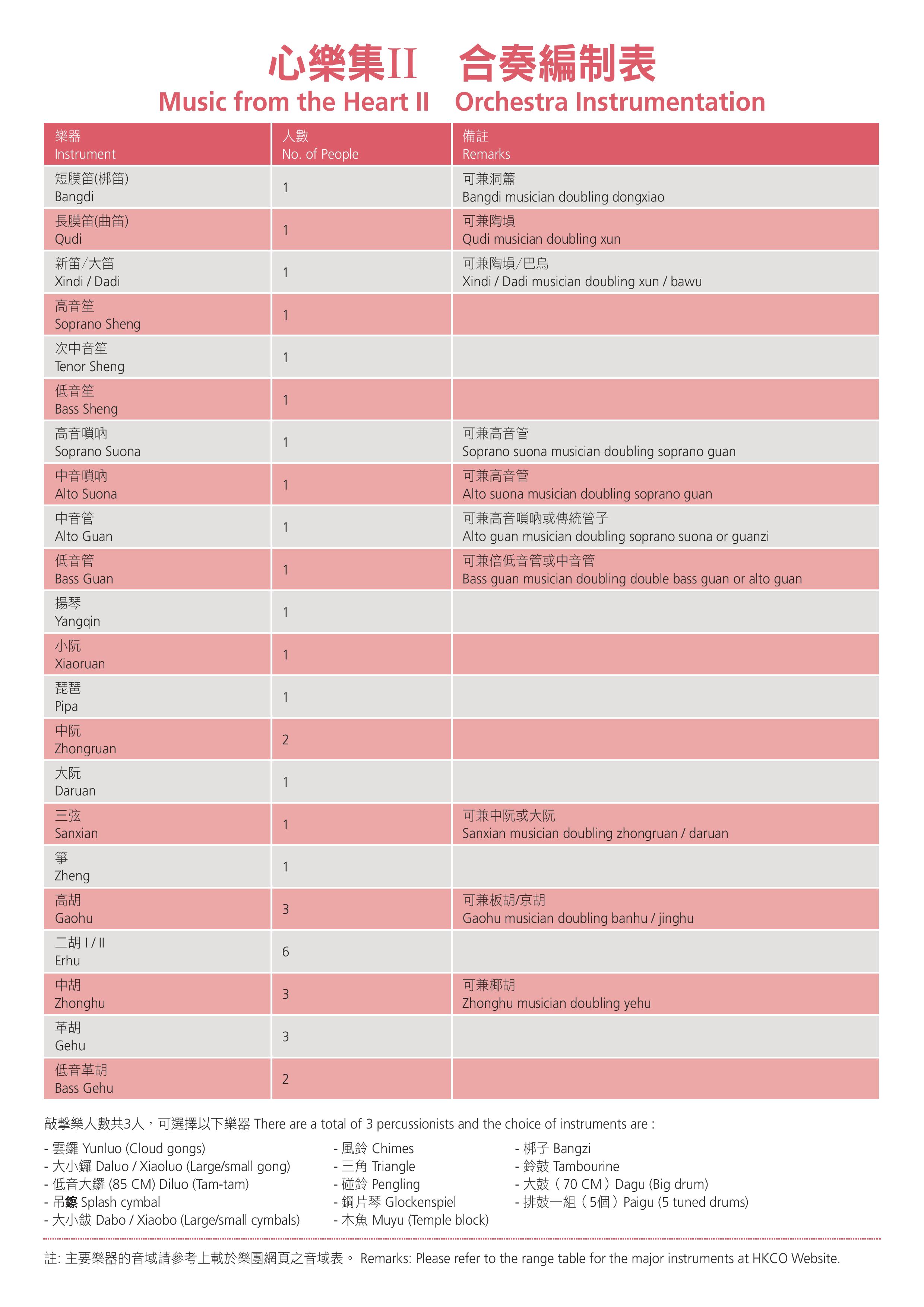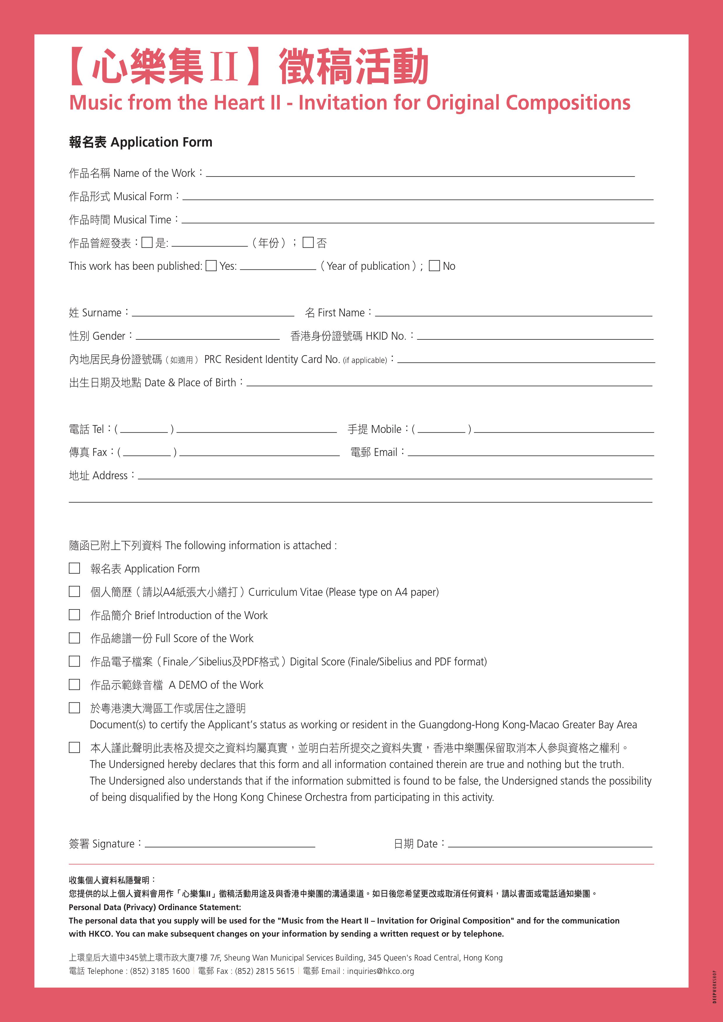 • 2020 年 1 月 31 日之前(以郵戳為憑)以郵寄方式寄至香港中樂團,郵寄信封請註明【心樂集II 徵稿】